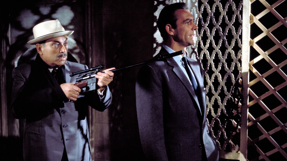 The story however, was not working. It was too complicated, and the rewrites for later scenes did not match earlier scenes. A disaster loomed, and this was the time for editor Peter Hunt to shine – his radical editing moved whole scenes around to make better sense, and one or two scenes were reshot and revoiced. It was this re-ordering of scenes that left one scene – of Bond’s double being killed, being left over, and Hunt came up with the idea of having it before the titles.. and a Bond tradition was born.
